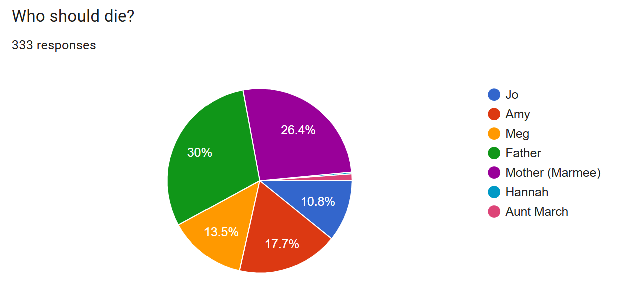 But, alas! Such joys lie alongside pain, dear readers! For the reaper’s scythe has begun to swoop, and at the business end lies the neck of one of the Marches. Without further ado, please say hello and goodbye to the first winner of the Little Women Death Poll: